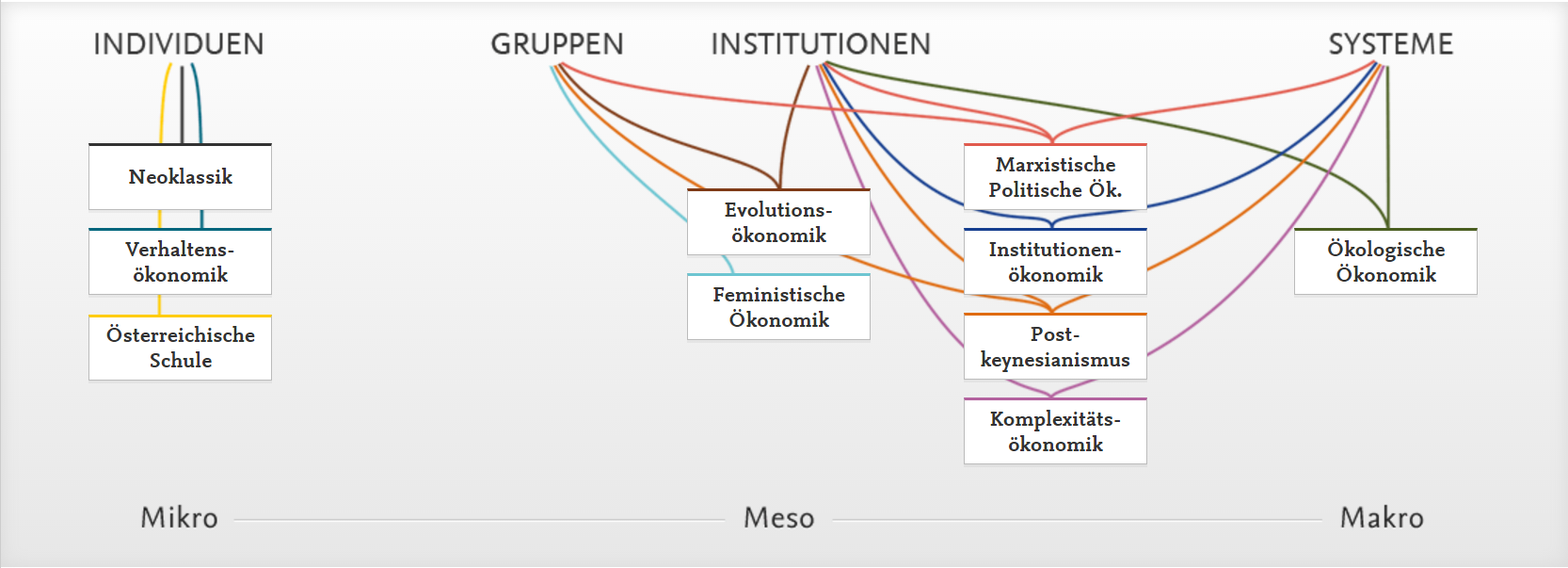 Diese Infografik präsentiert einen Vergleich der zehn wirtschaftswissenschaftlichen Denkschulen hinsichtlich der Frage, von welcher Ebene (Mikro-, Meso- oder Makroebene) die Analyse der Wirtschaft aus erfolgen sollte. Während sich die Komplexitätsökonomik, die Institutionenökonomik und die Ökologische Ökonomik vor allem mit der Analyse von Märkten, Rechts- bzw. Ökosystemen befassen, sind für den Postkeynesianismus oder die Marxistische Politische Ökonomik hauptsächlich Gruppen, Institutionen und Systeme – wie der Kapitalismus, verschiedene Wachstumsregime und Klassen – zentral für das Verständnis wirtschaftlicher Prozesse. Die Analysen dieser Schulen finden somit auf der Meso- und der Makroebene statt. Die Evolutorische Ökonomik und die Feministische Ökonomik orientieren sich an der Mesoebene: Erstere besagt, dass makroökonomische Prozesse nur über die Mesoebene erklärt werden können. Letztere, die Feministische Ökonomik, untersucht insbesondere die Wechselwirkungen zwischen Geschlechterverhältnissen und Arbeitsmärkten oder staatlicher Politik. Im Gegensatz dazu befindet sich die Neoklassik auf der Mikroebene – denn ihre Analysen gehen von (repräsentativen) Haushalten und Firmen aus –, ebenso wie die Verhaltensökonomik, die bei der Untersuchung menschlicher Entscheidungen ansetzt.