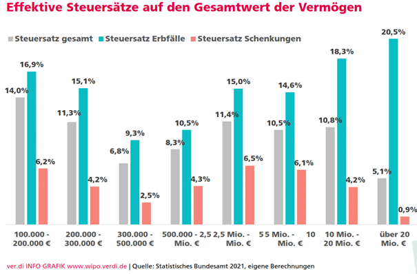 Bei der Erbschaft- und Schenkungsteuer besteht der größte Reformbedarf bei der Behandlung von Betriebsvermögen. Von geschätzt 400 Milliarden Euro jährlicher Vermögensübertragungen werden die meisten aufgrund ihres geringen Werts gar nicht erst erfasst. Steuerlich erfasst wurden 2019 knapp 80 Milliarden Euro: 39 Milliarden waren steuerpflichtig, 7,2 Milliarden Euro Steuern wurden festgesetzt. Dabei betrug der effektive Steuersatz bezogen auf den Gesamtwert der Erwerbe insgesamt neun Prozent, bei den Erwerben von über 20 Millionen Euro aber nur 5,1 Prozent, und bei den Schenkungen von über 20 Millionen Euro sogar nur 0,9 Prozent. Dabei betragen die nominalen Steuersätze bei steuerpflichtigen Erwerben über 26 Millionen Euro 30 Prozent, selbst bei unmittelbar Verwandten in Steuerklasse I.