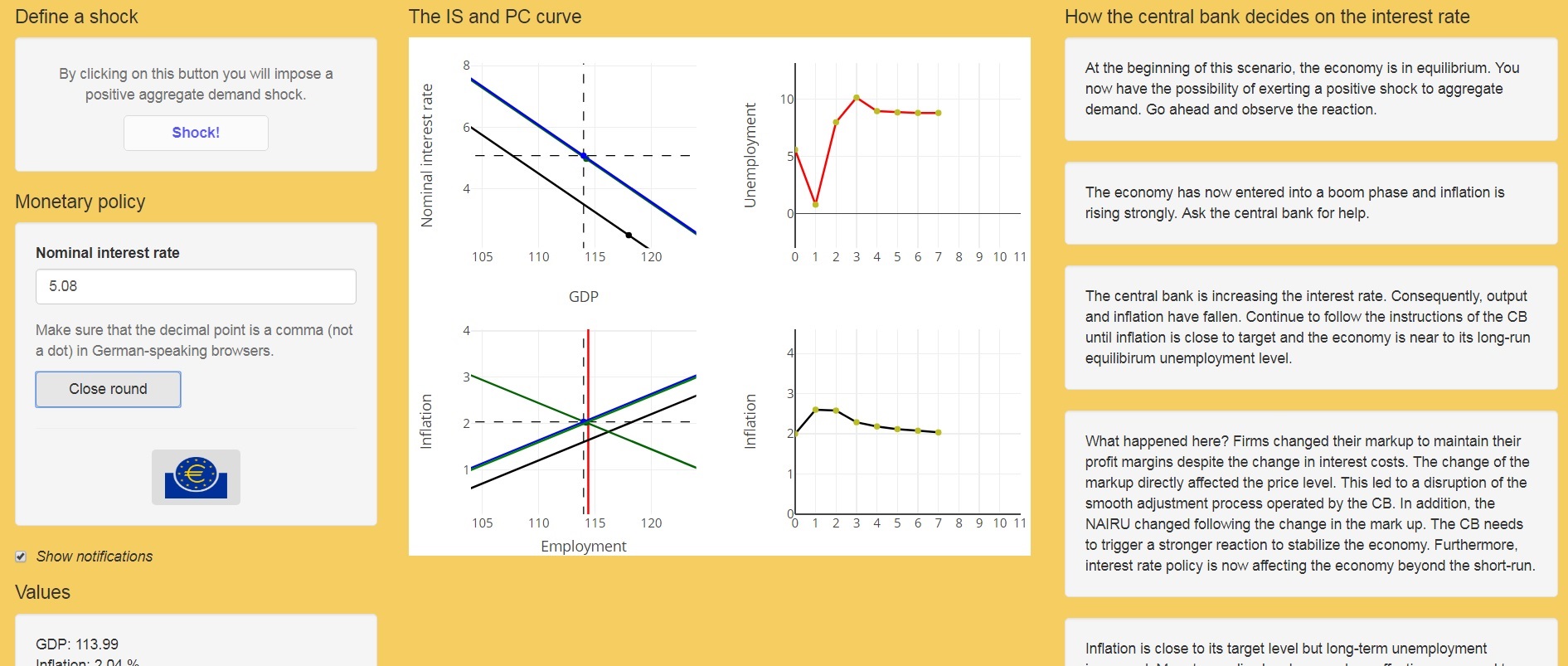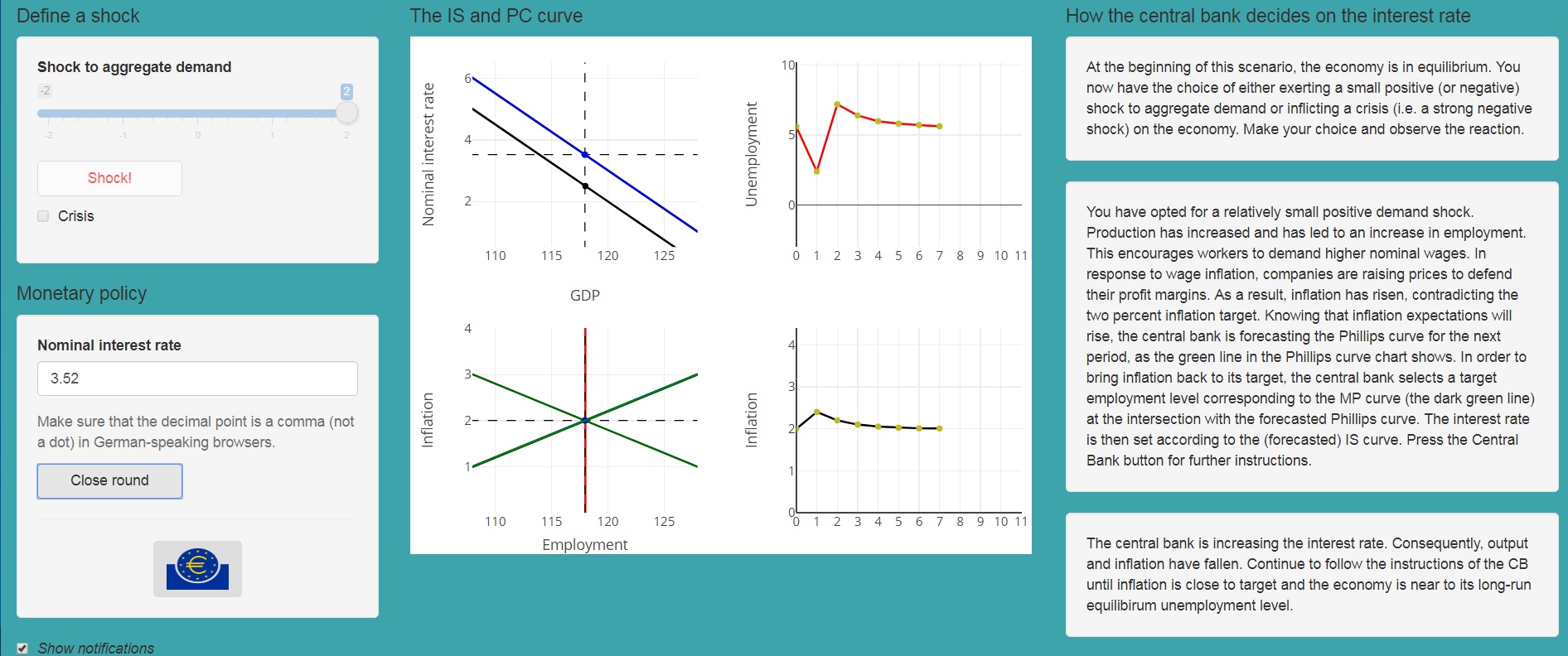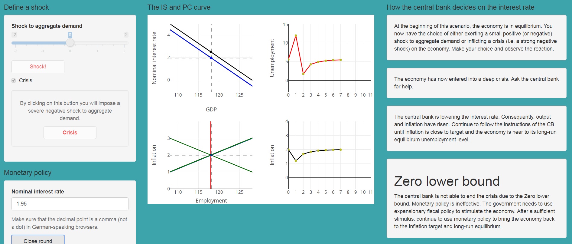 Die Nutzer_innen können im Simulator die Rolle der Zentralbank übernehmen, wobei das Ziel darin besteht, einen möglichst optimalen Anpassungspfad als Reaktion auf Angebots- und Nachfrageschocks zu wählen. Um diesen optimalen Pfad zu erreichen, müssen die Nutzer_innen also nachvollziehen können, wie ein optimaler Entscheidungsprozess der Zentralbank in dieser Modellwelt abläuft. Hierfür müssen sie die Grundmechanismen des Modells verstanden haben, die im begleitenden Online-Buch ausführlich erklärt werden. Dabei ergibt sich schließlich, dass es eine eindeutige Lösungsmöglichkeit für die Zentralbank gibt, welche gleichzeitig der effizienteste Weg ist, die Ökonomie wieder zum gleichgewichtigen Output zurückzuführen (Abb. 1(a)).