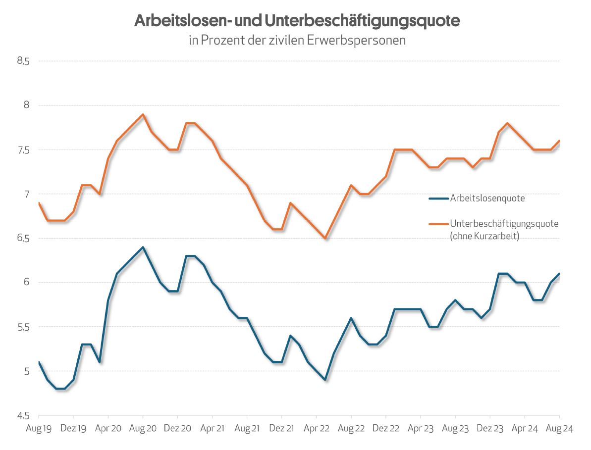 Die Arbeitslosenquote ist zwischen Mai 2022 und August 2024 um 1,2 Prozent bzw. um circa 603.000 Arbeitslose angestiegen, während die Unterbeschäftigungsquote im gleichen Zeitraum um 1,1 Prozent, das heißt, sich um etwa 612.000 Unterbeschäftigte erhöht hat.