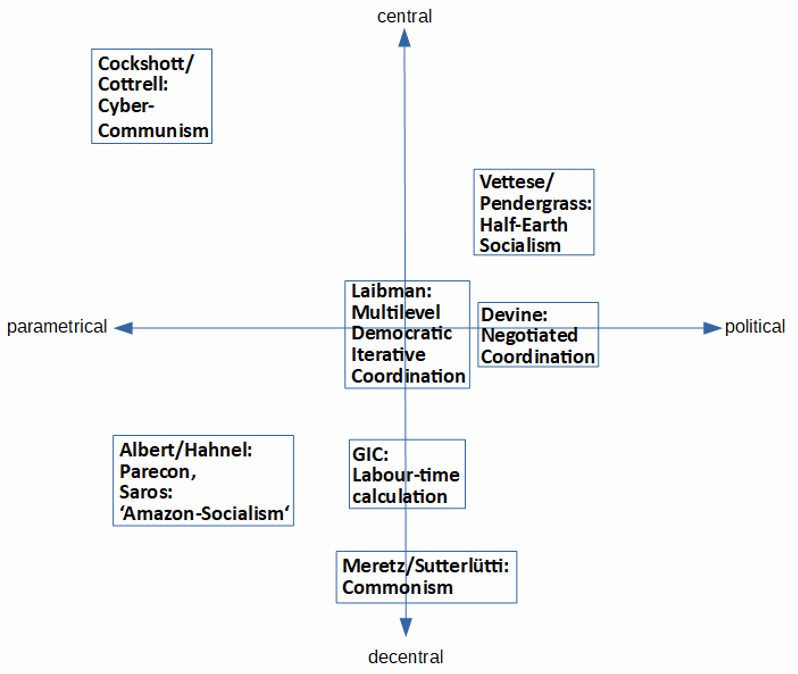 On the parametrical-political axis, Cyber-Communism is at the minimum, as its planning mechanism is primarily a technical, algorithmic process – even if there is implementation principles of ‘Athenian’ and direct democracy at the central level. Parecon and 'Amazonian socialism' are close to the minimum on this axis. These modes are characterised by a tension between a parametrical and a political process. While there are political processes at the enterprise level, inter-enterprise mediation ultimately amounts to a predominantly parametric process. Labour Time Calculation, Commonism and MDIC aim for mediation and thus lie in the middle of the axis - but with important differences. In Commonism, for example, there are parametric means in the sense of 'stigmergy’ signal', but the complete voluntariness of the whole process means that they don't necessarily have to relate to them. In the other two, the parameters amount some sort of socialist prices. In Negotiated Coordination there are also quantitative, parametric elements, but the emphasis is on the political, personal process of deliberation; hence it is further along the positive axis than Laibman. Half-Earth Socialism is deeply sceptical about the benefits of some sort of price system, although multidimensional parameters in kind are considered. As a result, the allocation decisions made by means of linear programming are predominantly political, though democratic, deliberative bodies.