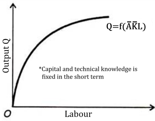 Assuming technical knowledge and capital is fixed in the short term (as indicated by the bars on top of A and K) allows the production function to be graphed, as seen in Figure 1.