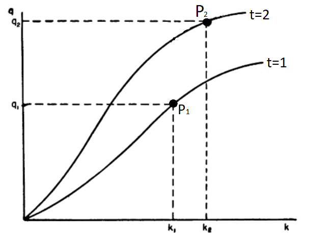 The above production function is completely represented by a graph of q against k, showing neutral shifts in technical progress and constant returns to scale. An increase in output, for example from P1 to P2, is compounded by a movement along the curve and a shift of the curve. However, if the shift factor for each point of time can be estimated, the observed points can be corrected for technical change to reveal the underlying production function.