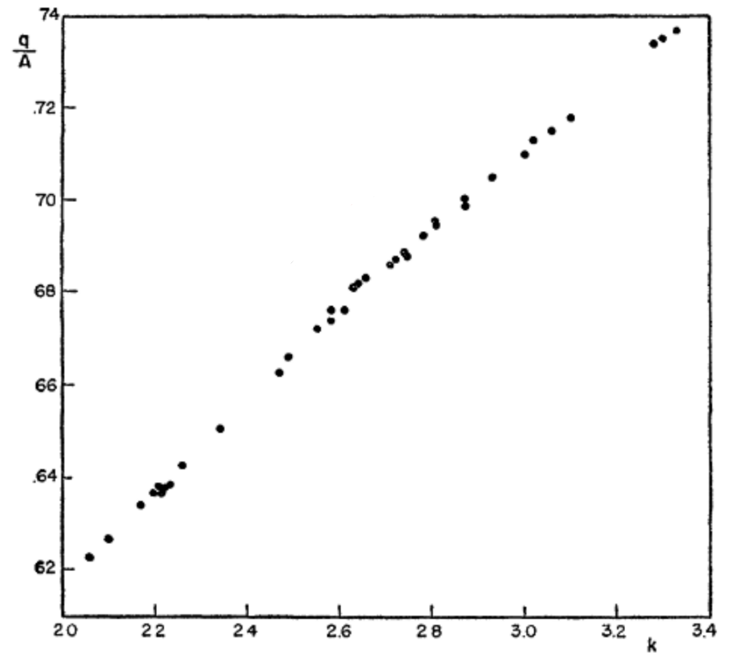 To map the underlying production function, Solow divided both sides of the composite production function equation by A(t) to get q = f(k). Figure 4 shows a scatter of q/A against k. Solow remarked that the fit was remarkably tight and that there was a noticeable curvature in the row of points. He concluded that the curvature implied diminishing returns to scale as k increases along the horizontal axis, and that the points representing the underlying production function best fit a Cobb-Douglas production function.
