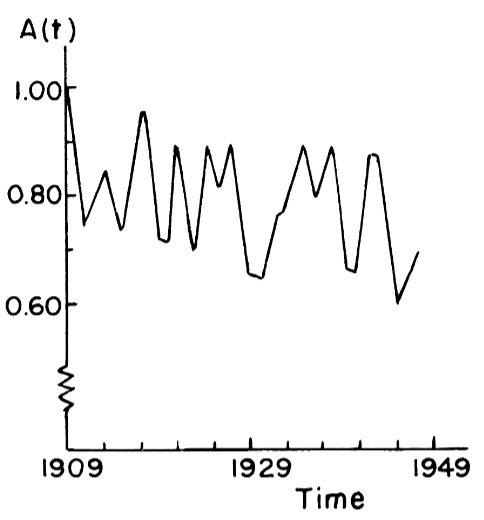 All Solow needed now was time series data to be able to isolate a series for technical progress. Towards this end, he gathered real output data for the USA between 1909 and 1949. For q, he used a time series of real private GNP per labour hour. For k, he used Goldsmith’s (unpublished) estimate of capital goods in existence corrected by a ratio representing idle resources. For the share-of-capital series, he “pieced it together from various sources and ad hoc assumptions” (Solow, 1957: p.314). Solow ran the data through Equation 6 and calculated the technical change time series (See Figure 3).