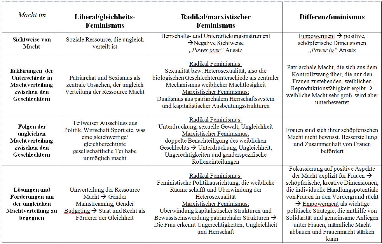 Da der Differenzfeminismus extrem vielschichtig ist und sehr pluralistische Ansätze vertritt, ist es nicht verwunderlich, dass dies auch auf die machttheoretischen Konzeptionen zutrifft. Aus den vielen unterschiedlichen Vorstellungen über Macht, wird der Fokus auf den Kerngedanken dieser Denkschule gelegt. Besonders wichtig in dieser Hinsicht, ist die Erkenntnis, dass im Differenzfeminismus mit dem Begriff der Verschiedenheit gespielt wird. D.h. es gibt keine Einigkeit darüber, wie der Begriff des Geschlechts zu sehen ist und was ihn wirklich kennzeichnet. Eine bekannte differenzfeministische Strömung, cultural feminism, konzipiert das weibliche Geschlecht als positiv, sowohl in Hinsicht auf Reproduktion, als auch in Hinsicht auf Werte, die dem Geschlecht zugeschrieben werden können. ,,Der weibliche Körper fungiert hier als Auslöser für Eigenschaften wie etwa Fürsorge- und Empathiefähigkeit, Beziehungsoffenheit und Kooperationsbereitschaft sowie Friedfertigkeit und Naturverbundenheit. Damit sind, so eine weitere Idee, originär weibliche Werte und Macht verbunden, die gegenüber dem Männlichen positiv (oder ihm zumindest gleich-gestellt) und aufgrund dessen aufzuwerten sind“ (Sirmasac 2012: 39f.). Im Hintergrund nimmt die patriarchale Macht von Männern eine zentrale Rolle ein, die dem positiven Gesamtbild des weiblichen Geschlechts gegenübersteht. Eine überhöhte natürliche Männlichkeit in Bezug auf Macht und Unterdrückung von Frauen ergeben sich dahingehend, da Frauen aufgrund ihrer regenerativen Funktion und schöpferische Fähigkeit zur Erhaltung der Menschheit, enorm viel Macht besäßen. So besitzt die Frau die Fähigkeit neues Leben zu schaffen, zu erhalten und zu umsorgen im Gegensatz zur männlichen unterdrückerischen und zerstörerischen Macht. (vgl. Sirmasac 2012: 40f.) Der männlichen Realität entspricht der machttheoretische Ansatz von ,,power over“, welcher als Unterdrückungs- und Herrschaftsinstrument konzipiert ist. Im Gegensatz dazu wird das weibliche Machtverständnis von ,,power to“ Ansatz geprägt. Dies entspricht einer Wandlung des Machtverständnisses in der feministischen Debatte, da in dieser Denkschule, Macht, explizit auf Frauen bezogen, positive Eigenschaften besitzt und individuelle und Handlungspotenziale von Frauen in den Vordergrund gerückt werden (vgl. Sauer 2012: 386). ,,Zwangsfreie Autorität legitimiert sich durch Anerkennung; zwangbe-haftete Autorität hingegen kreist um die Unterordnung des Anderen. Genau hier scheidet sich für French power-to (Macht zu) von power-over (Macht über), weibliche Macht von männlicher Macht also.“ (Sirmasac 2012: 42). Nicht mehr die Ablehnung von Macht, sondern mithilfe der Macht positives zu schaffen, steht mit dem Konzept von ,,power to“ im Vordergrund. Dieses Machtkonzept wird als schöpferische Fähigkeit gesehen, die mithilfe des Empowerments zu einer Besserstellung der Frauen in Gesellschaft führen kann und sich nicht äußert „as the desire to destroy (power over others) but as the desire to create (power to do for others)“ ( Sirmasac 2012: 41). Empowerment wurde zu einer politischen Strategie und zu einem erkenntnistheoretischen Ansatz der Befreiung aus der Geschlechter Herrschaft, welches die symbolische Selbstbemächtigung und gemeinschaftliches Anliegen von Frauen in den Mittelpunkt stellt. Solidarität unter Frauen kann eine positive Macht entstehen lassen, die Herrschaft mithilfe kollektiver Frauenmacht abbauen lässt (vgl. Sauer 2012: 387). Explizit wurde dieses Konzept auch von der lesbischen- und ökofeministischen Szene übernommen. So definiert Sarah Lucia Hoagland Macht als, ,, “power-from-within” which she understands as “the power of ability, of choice and engagement. It is creative; and hence it is an affecting and transforming power but not a controlling power” (Allen 2016: o.S). Anzumerken ist auch, dass das Machtkonzept des Empowerments, sehr stark von Hannah Arendts Machtdefinition beeinflusst worden ist. Arendts Unterscheidung zwischen Macht und Gewalt und ihr performativer Machtansatz, der eine interaktive und relationale Komponente enthält, stützt die Gegebenheiten des Empowerments. Macht ist aus Arendts Sichtweise etwas relationales, ,,ein Vermögen, das sich nur in der Interaktion, in der gemeinsamen Praxis von Menschen verwirklicht“ (Sauer 2012: 386). Dazu ist Macht oft an Gruppenangehörigkeit gebunden, da für sie politische Macht zentral ist, wobei Macht ab den Zeitpunkt nicht mehr herrscht, wo Gewalt angewendet werden muss. Aus dieser Perspektive heraus, lehnt Arendt Webers Machtbegriff ab und formuliert Macht als “the human ability not just to act but to act in concert” (Allen 2016: o.S.), welcher sehr dem Begriff des Empowerments inne geschrieben ist, wo gemeinsames Handeln und Solidarität untereinander, zur Verbesserung der Situation von Frauen und positive Stärken der Macht forciert werden (vgl. Sauer 2012: 387). Fasst man nun diese nur groben und grundlegenden Definitionen der drei Denkschulen zusammen, lässt sich folgende Abbildung daraus erstellen.