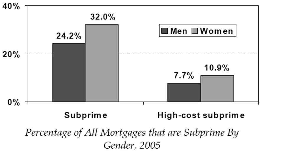 Fasst man nun alle wesentlichen, aus der heterodoxen bzw. makroökonomischen Ursachenanalyse zusammen, lässt sich, in Verbindung der genderspezifischen Aspekte der feministischen Ökonomie, ein ganz gutes Gesamtbild über die Entstehung der Immobilien- und Subprime-Krise, erzeugen. Da Minderheiten und besonders alleinstehende Frauen kaum Vermögen, Einkommen zur Verfügung hatten, um ihren Konsum und Lebensstandard zu sichern oder zu steigern, wurden der Häuserkauf und die daraus erzeugte Nachfrage nach Subprime-Hypotheken, das oft einzige Mittel, ökonomische Sicherheit und Lebensstandardsicherung zu erreichen. In Amerika ist der Besitz einer Immobilie, ein wichtiges Statussymbol und wird als Ersatz wohlfahrtstaatlicher Leistungen angesehen, welches sich in eine Art Bürgerrecht entwickelte (vgl. Young 2010: 264f.). ,,Das Recht auf Wohneigentum wurde im Diskurs der täglichen Politik zur Normalität, ausgehend von der weit verbreiteten Annahme, Wohnimmobilien seien eine sichere Anlage für die Altersversorgung und gleichzeitig ein funktionales Äquivalent der stagnierenden Reallöhne und gekürzten Sozialleistungen“ (Young 2009: 18). So spielte auch von staatlicher Seite her, die Forderung, dass jede Amerikanerin ein Haus besitzen soll, neben der Finanzialisierung anhand der genannten Finanzinnovationen, eine entscheidende Rolle bei der Vergabe von Subprime-Hypotheken, welcher einherging mit einem stetigen Wachstum des Kreditangebotes. Dies war insofern problematisch, da die Subprime-Hypotheken an Menschen vergeben wurden, die kein Einkommen, kein Vermögen, also auch eine sehr geringe Bonität aufweisen konnten, wodurch sie die Zinsen bei den Banken nicht mehr bedienen konnten, falls diese steigen, was beim Platzen der Immobilienblase auch geschehen ist. Die Subprime-Hypotheken gingen einher mit einer exzessiven Verschuldung der privaten Haushalte, was nur so lange gut gehen konnte, solange die Häuserpreise stetig stiegen (vgl. Young 2009: 18ff.). D.h. es kam auf dem amerikanischen Immobilienmarkt zu einer Blasenbildung, die von steigenden Häuserpreisen abhängig war und getrieben wurde von einer exzessiven privaten Verschuldung, welches ein sehr instabiles Konstrukt erzeugen ließ, die in Verbindung mit der Renditen Gewinnen aus den Finanzinnovationen die prozyklische Tendenz noch verstärkte, indem der Subprime-Kredit Anteil in den Finanzinnovationen vernachlässigt wurde, da die Produkte von den Ratingagenturen ja gut bewertet wurden (vgl. McCulley 2009: 262-265). ,,A key part of keeping the three bubbles (property valuation, mortgage finance, and the shadow banking system) going was that the rating agencies thought the default rates would be low because they had been low. But they had been low because the degradation of underwriting standards was driving up asset prices.“ (McCulley 2009: 265). Dabei wurden die Subprime-Hypotheken verstärkt an Frauen und Minderheiten vergeben, da sie diejenigen in der Bevölkerung ausmachten, die laut interner Bankbewertungen, die geringsten Bonitätswerte aufwiesen und sie selbst auf diese angewiesen waren. Anhörungen im US Senat, haben jedoch gezeigt, dass Frauen oftmals mehr Subprime-Hypotheken annehmen mussten als Männer, obwohl einige von Ihnen eine höhere Bonität besaßen als die männlichen Hypothekennehmerinnen (vgl. Young 2009: 18ff.). ,,Despite that women have on average higher credit scores than men (682 versus 675), women borrowers are more likely to receive sub-prime loans at every income level. Women with income levels twice the median income are 46.4 percent more likely to have to accept subprime loans than men with similar Earnings“ (Young 2010: 270). Folgende Abbildung zeigt den Anteil der Subprime-Hypotheken von Frauen gegenüber Männern. Frauen erhielten unverhältnismäßig mehr Subprime-Kredite als Männer