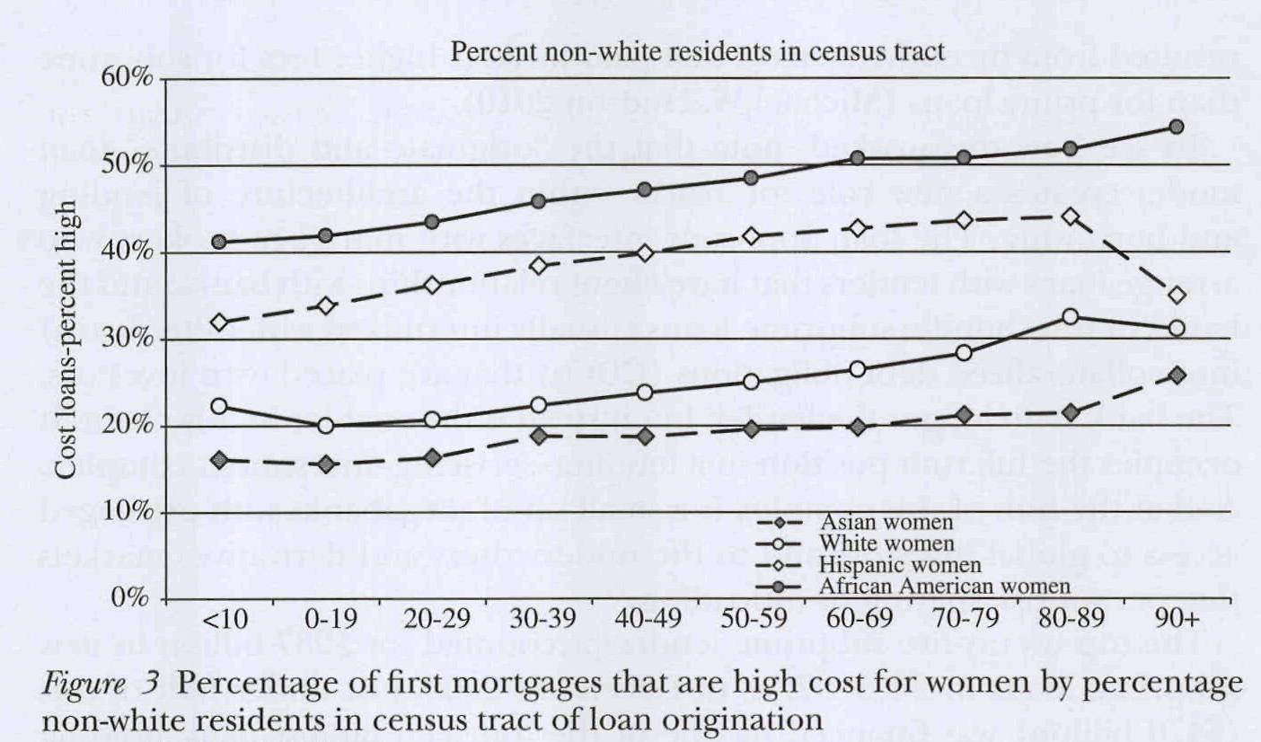 Besonders stark betroffen waren alleinstehende Frauen und diejenigen Frauen die einer Minderheit angehörten, was der Immobilienkrise eine Gender und ethnische Dimension verleiht. Am häufigsten wurden Subprime-Hypotheken an afroamerikanische und lateinamerikanische Frauen vergeben. ,,African American women were the most likely to receive subprime loans regardless of income. While single women across ethnic lines have made strong inroads into home ownership, purchasing nearly one in five homes sold in 2003,it was African American and Latino women who actively sought out home purchase loans“ (Young 2010: 271). Folgende Abbildung zeigt diese Problematik auf