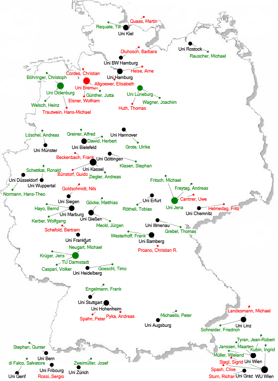 Abbildung 1: Landkarte pluraler und heterodoxer ökonomischer Standorte in Deutschland, Österreich und der Schweiz; Ökonom_innen, die dem pluralen Mainstream zugeordnet wurden, sind grün, heterodoxe rot dargestellt.