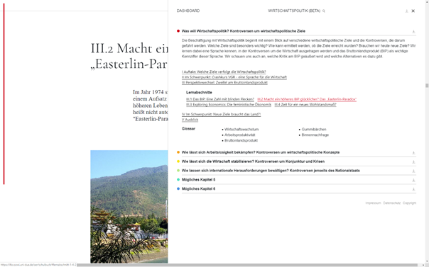 Ziel des Projektes war, ein offenes Online-Lehr- und Lernmittel für die Bearbeitung des Inhaltsfeldes Wirtschaftspolitik (Sek. II) zu schaffen.