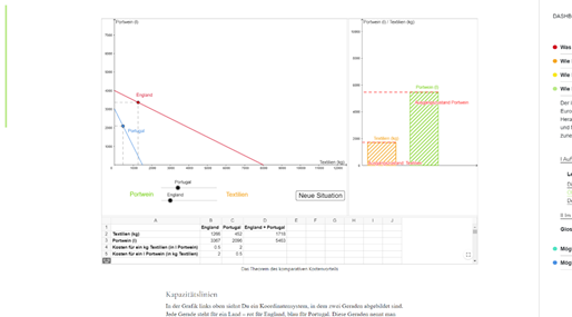 H5P bietet dabei die Möglichkeit, aus einer großen Menge von Inhaltstypen zu wählen, aus der ohne große Vorkenntnisse eigene Anwendungen entwickelt werden können, beispielsweise Quiz, Zuordnungsaufgaben, interaktive Präsentationen und Abbildungen, Lückentexte, interaktive Videos, Zuordnungsspiele oder Zeitleisten. Es wird bewusst eine breite Zahl von Inhaltstypen verwendet, um die Lehrkräfte zu einer Auseinandersetzung mit den vielfältigen Möglichkeiten von H5P anzuregen. Geogebra als Mathematiksoftware findet bereits Verwendung im Mathematikunterricht und bietet sich in unserem Kontext an, um dynamisch-interaktive Visualisierungen ökonomischer Zusammenhänge und Modelle zur Verfügung zu stellen. Als dynamisches Werkzeug eröffnet es gute Möglichkeiten in der Vermittlung von Inhalten, die bei statischen Abbildungen nur eingeschränkt stattfinden kann. Mehr als 70 solcher Anwendungen haben wir für das Lehrmittel bereits erstellt.