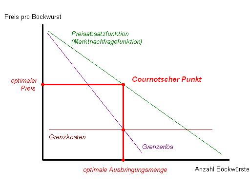 Sehr gut nachvollziehbar ist ein Monopol an folgendem Beispiel: Nehmen wir an, Fleischermeister Mett betreibt die einzige Fleischerei in der Stadt. Mett hat somit eine Monopolstellung zur Herstellung von Bockwürsten innerhalb der Stadt. Zur Vereinfachung unterstellen wir Mett, dass er keine Fixkosten zur Betreibung seiner Fleischerei hat. Ebenso unterstellen wir, dass er zur Herstellung einer Bockwurst immer die gleichen Grenzkosten hat. Die Abbildung optimale Ausbringungsentscheidung eines Monopolisten soll dabei zur Verdeutlichung dienen. Die Abbildung zeigt die Preisabsatzfunktion, aus dieser sich die Grenzerlösfunktion ergibt. Der Grenzerlös drückt dabei aus, wie viel Mett mehr verdient, wenn er eine Bockwurst mehr verkauft. Die Grenzkosten drücken dabei aus, wie viel Mett die Herstellung einer Bockwurst kostet. Mett fragt sich nun, bei welcher Ausbringungsmenge und Preis sein Optimum und somit sein Gewinnmaximum liegt. Würde Mett die Bockwurst für einen sehr hohen Preis anbieten, wäre die Nachfrage entsprechend gering. Er passt also den Verkaufspreis für eine Bockwurst an, bis die Grenzkosten dem Grenzerlös entsprechen. Mett erzielt also solange einen Zusatzerlös, bis die Grenzkosten gleich dem Grenzerlös sind und genau diese Ausbringungsmenge und der dazugehörige Preis (Parallelverschiebung zur Preisabsatzfunktion = Cournotscher Punkt) wäre Mett sein Optimum und somit sein Gewinnmaximum.